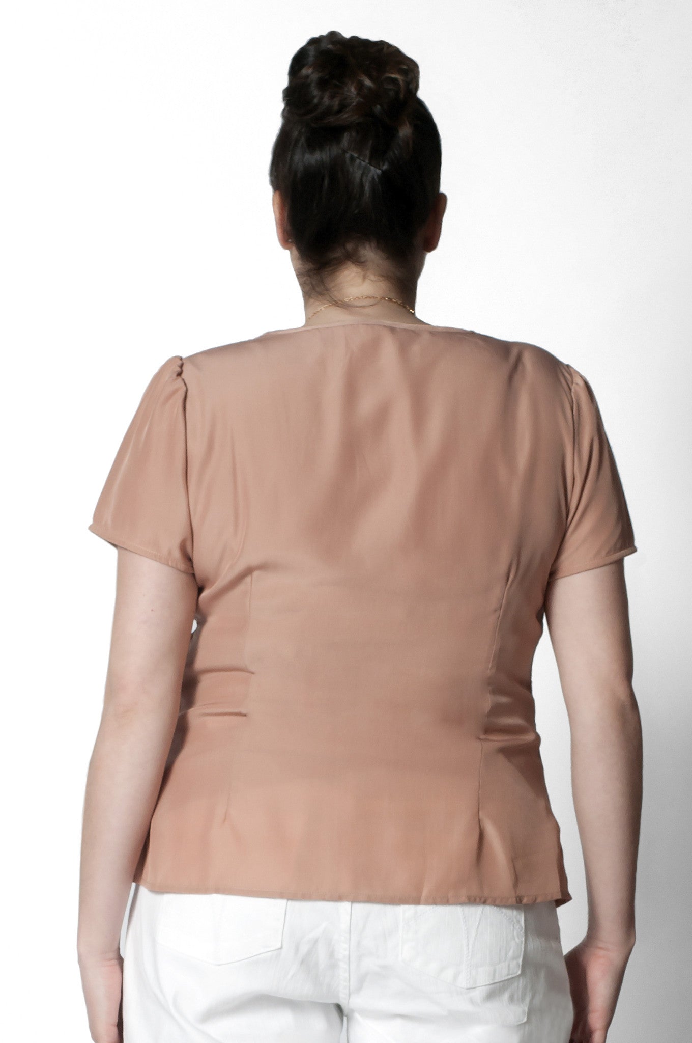 This short sleeve pin tuck top with 12 inch side zipper is in a pretty rose color. The fabric is very soft with a silk-like feel. The top has vertical seams down the front. This top is great for the office, but is also right for casual wear.