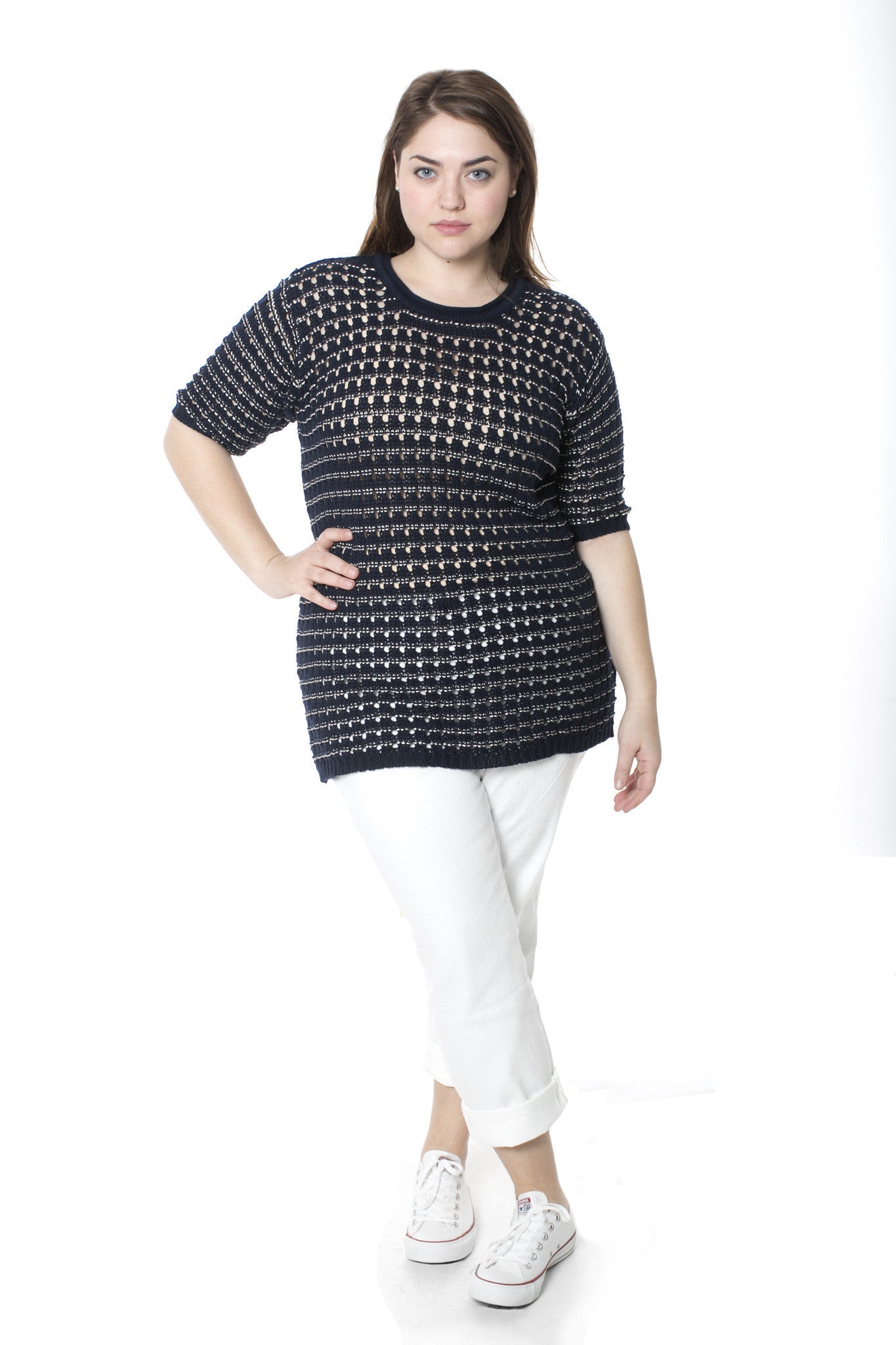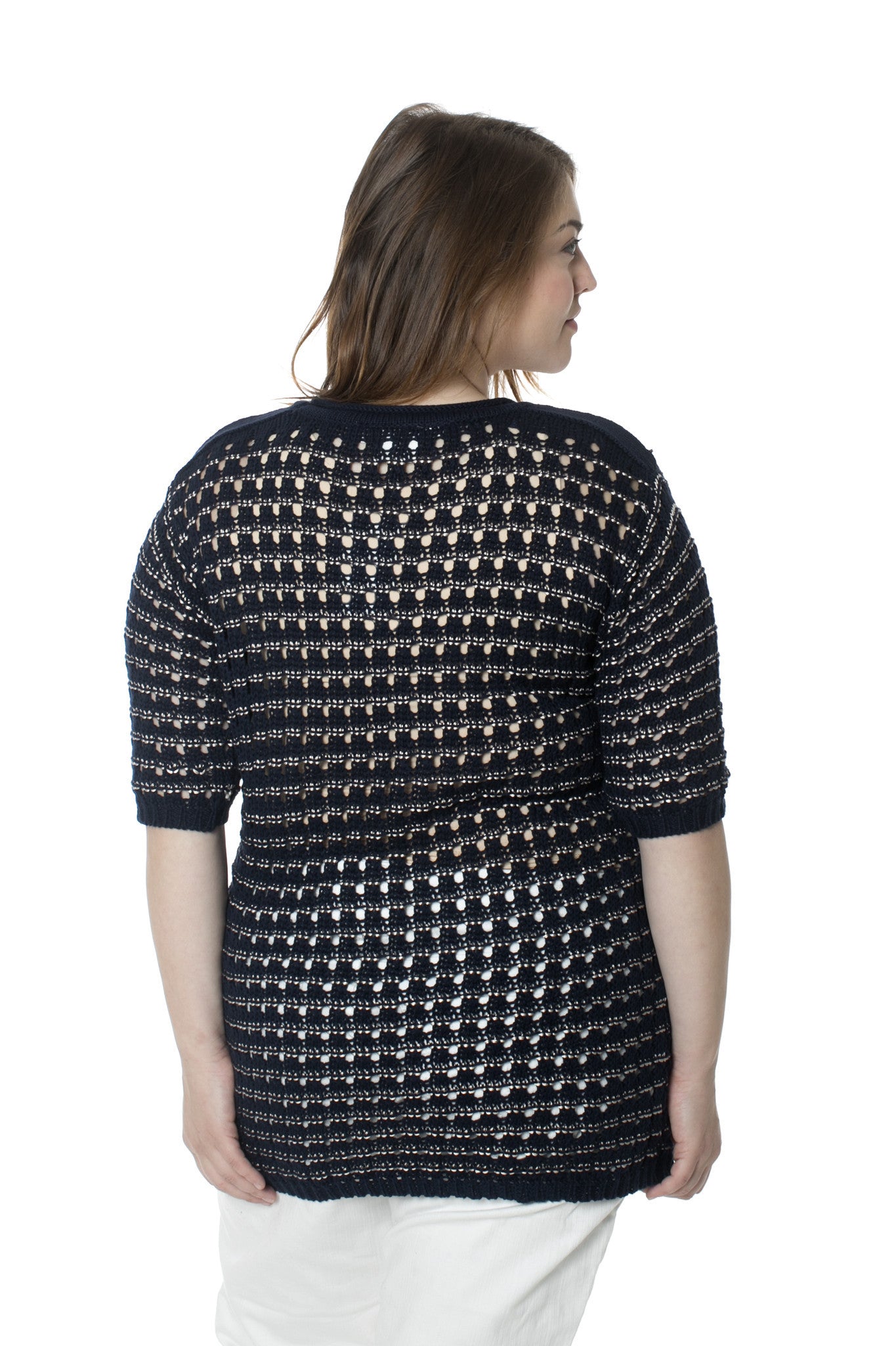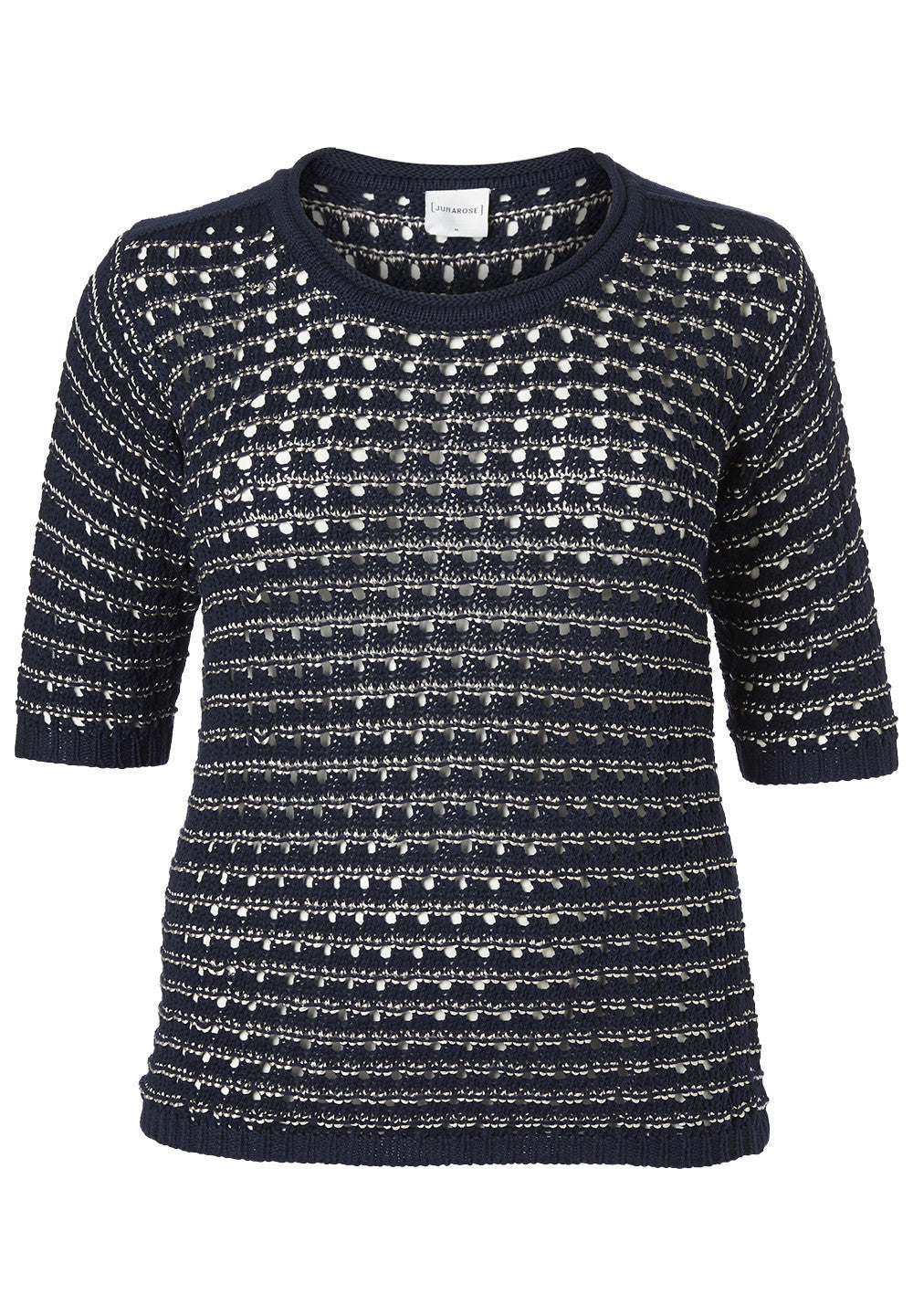 View full details for sizing info. This casual knitted sweater is navy with silver thread going through it. It's a hits at the hip (27" from neck to hem) and has elbow length sleeves. It's an open knit, that may require a cami underneath.