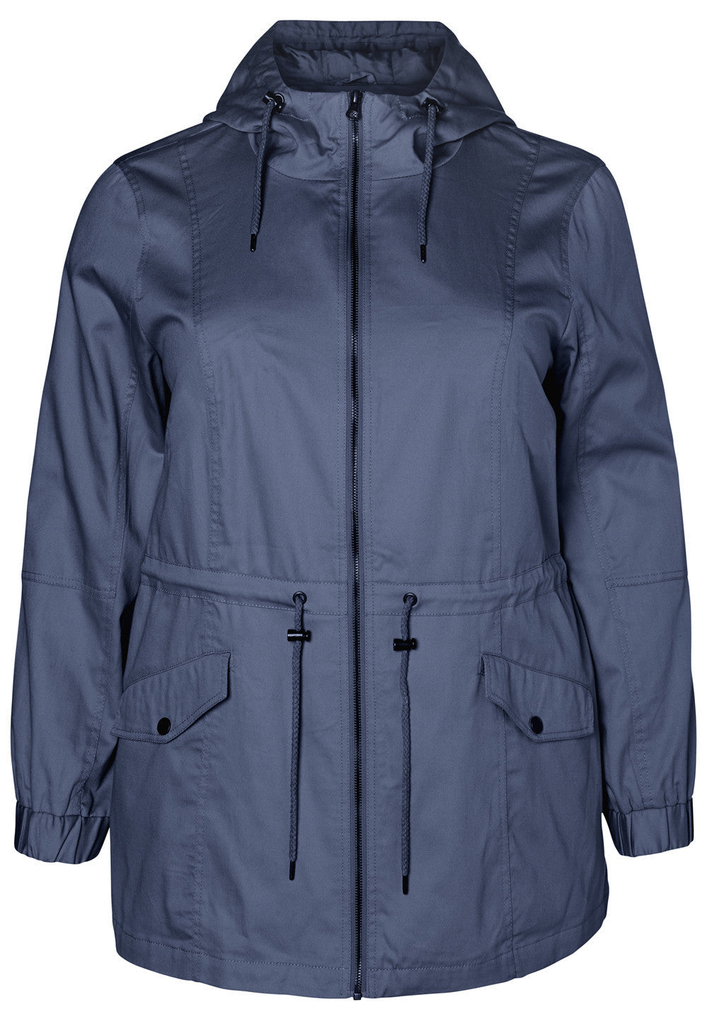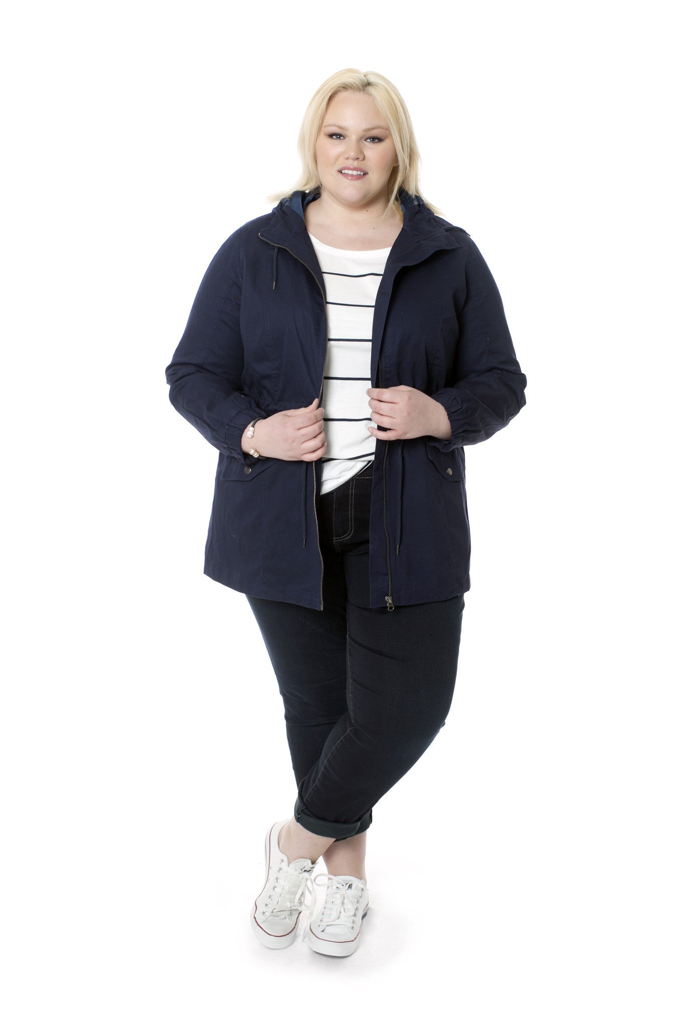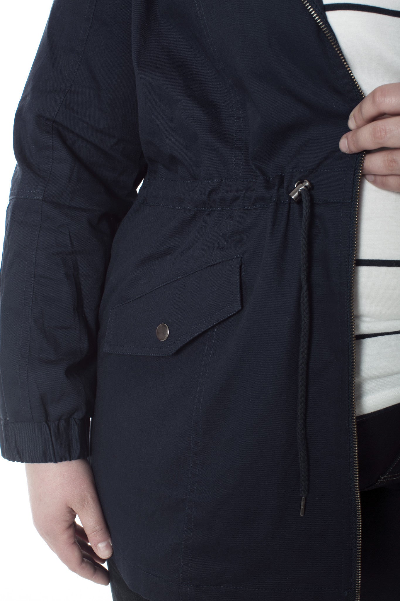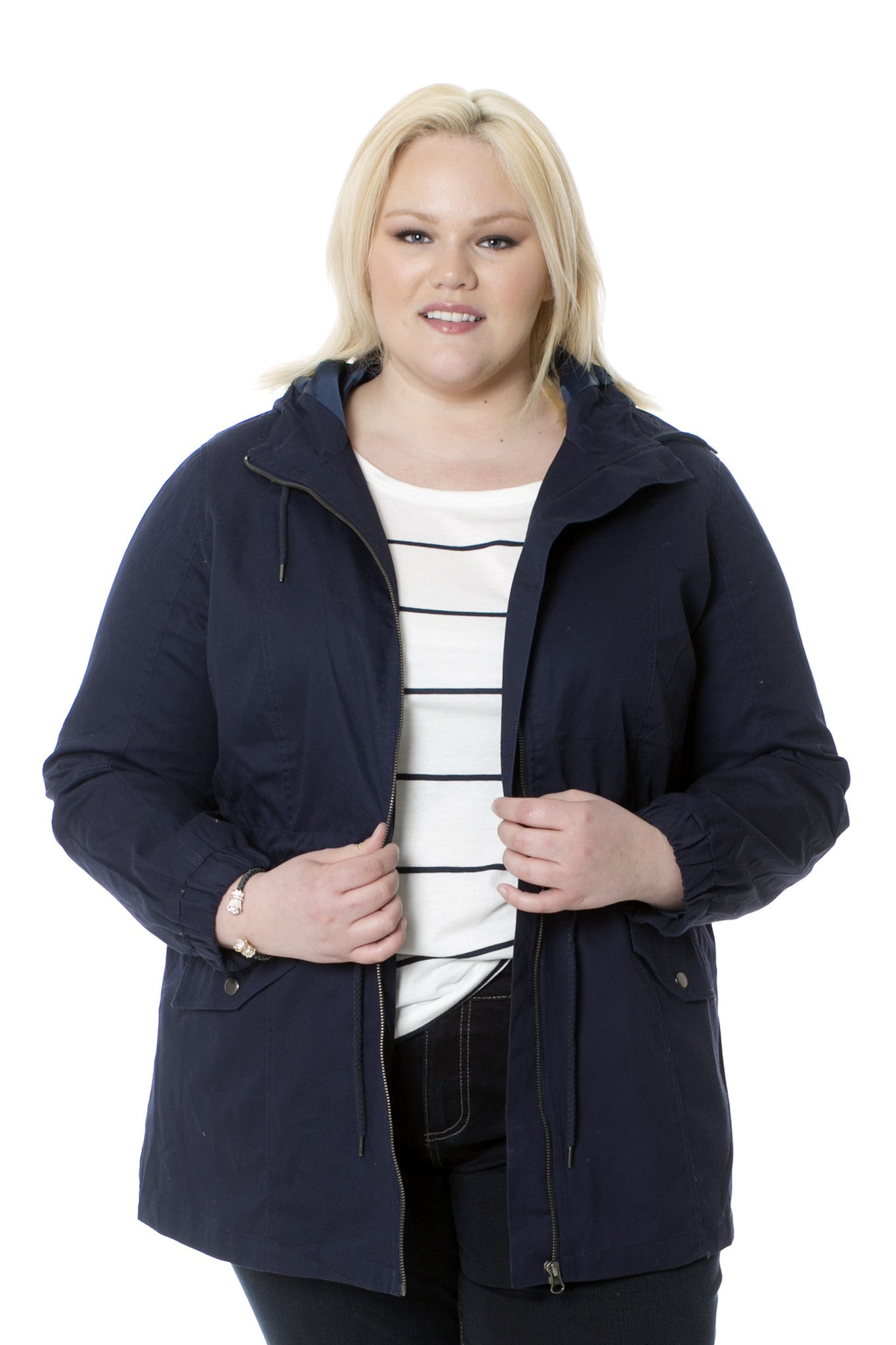 View full details for sizing info. Navy anorak style jacket with hood. Two front pockets with snap closures, zip up front closure and high neck. The jacket has a drawstring waist and the hood also has drawstrings to adjust the opening. Machine washable cotton with polyester lining.