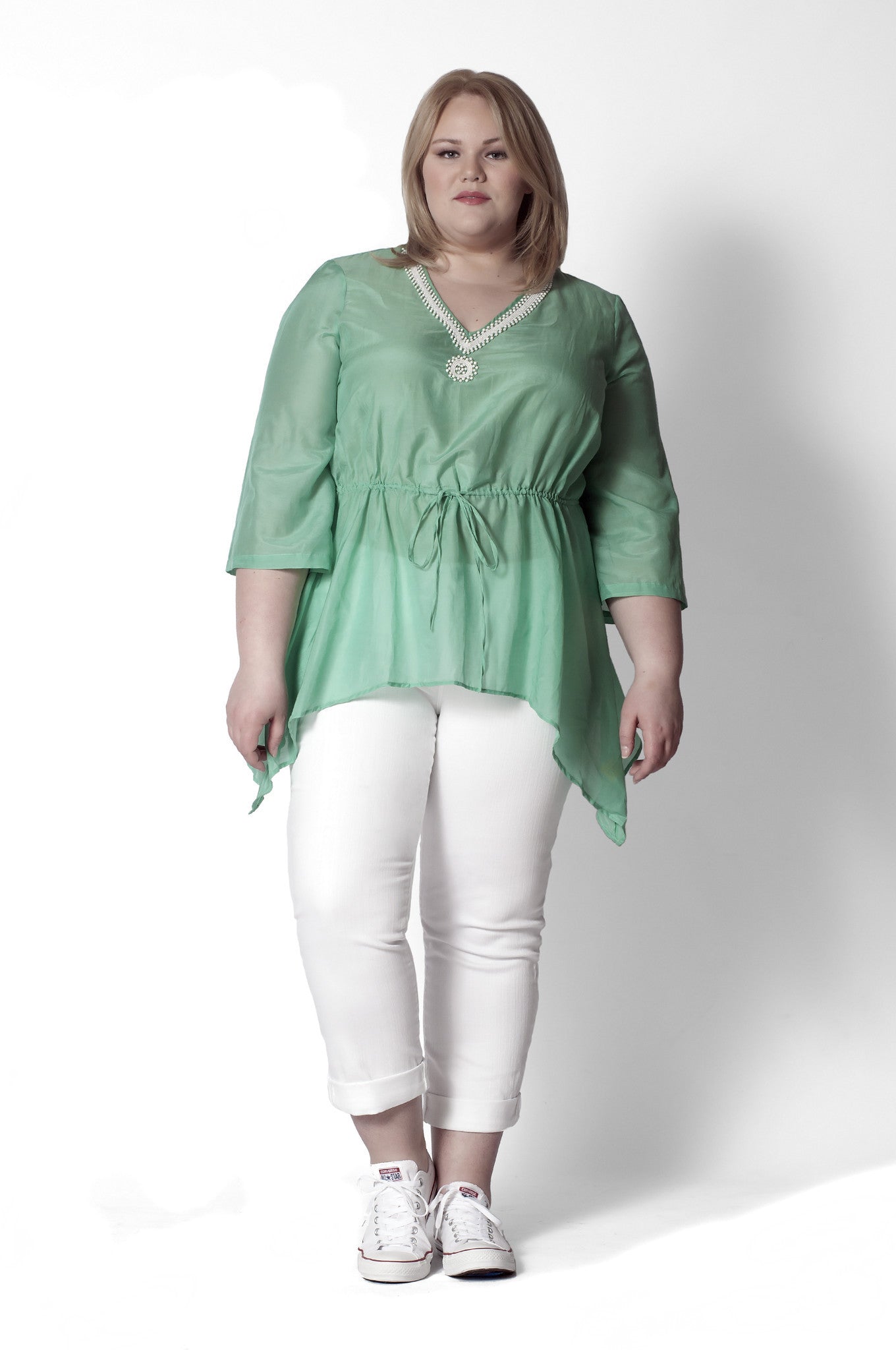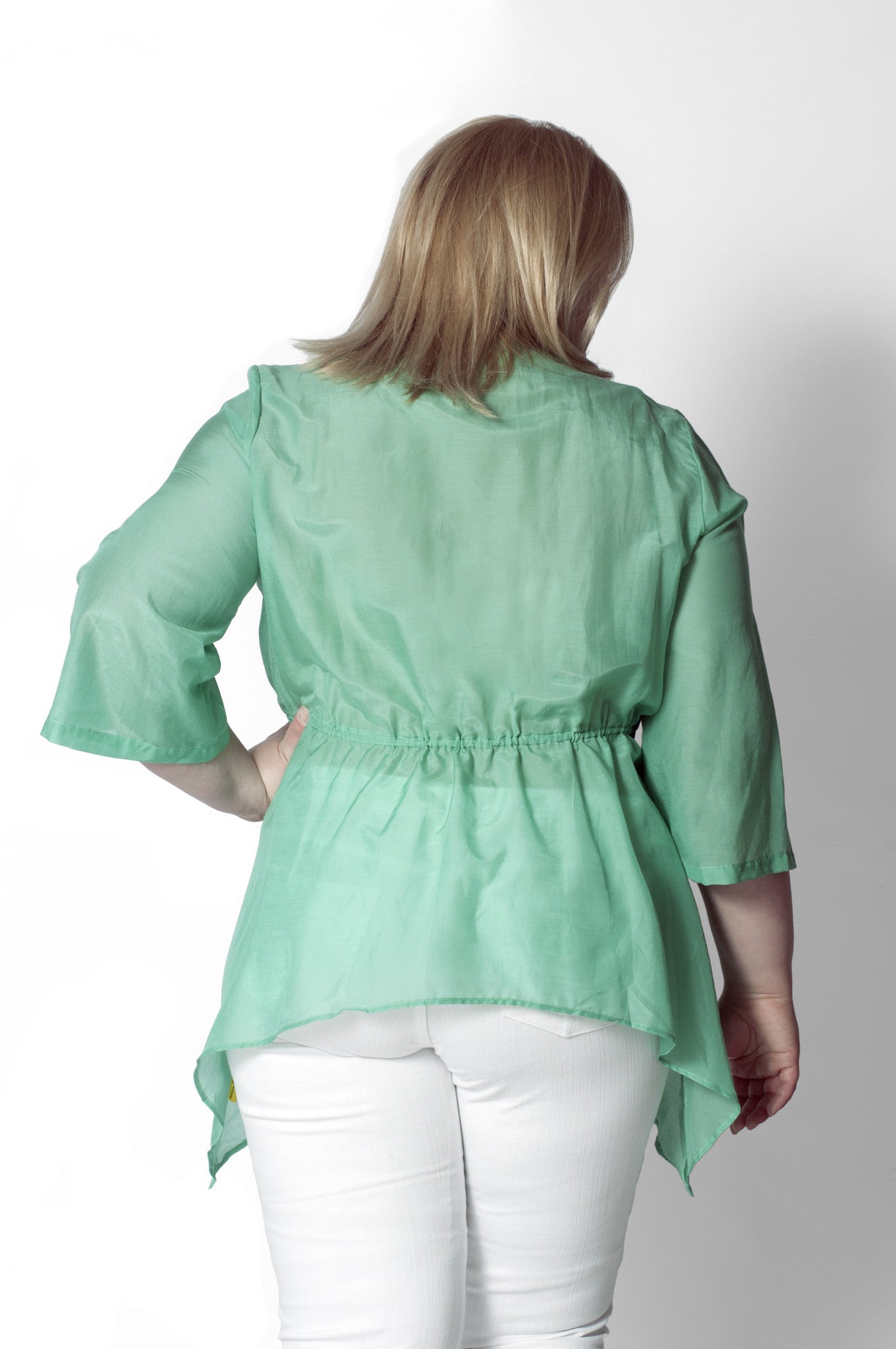 This luxurious sharkbite-hem tunic in 100% silk. This top has a V-neck and a drawstring at the waist. The neck is hand embroidered with beautiful white and green beading.